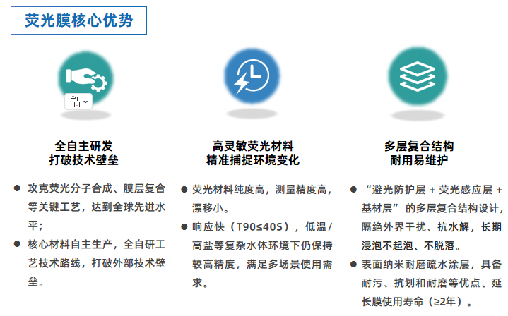 污水處理曝氣池 | 高濁度、強(qiáng)酸堿、懸浮物多 | 電極法雙層復(fù)合透氣膜/熒光法PEEK基底膜 | 耐化學(xué)腐蝕、抗堵塞 |